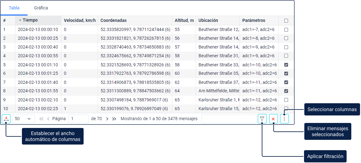 Si es necesario cargar 500 o 1000 mensajes por página, no se recomienda ampliar el ancho de las columnas automáticamente, ya que esto puede ralentizar la carga de mensajes, especialmente si la cantidad de parámetros se diferencia en varios mensajes.