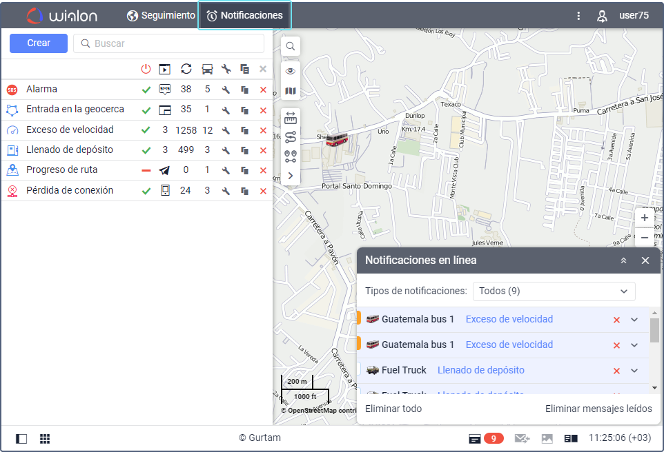 Con las notificaciones en el sistema de rastreo, puede controlar el cambio de posición de unidades, valores de sensores, asignación de conductores, remolques, etc. En caso de activarse la notificación, son posibles: