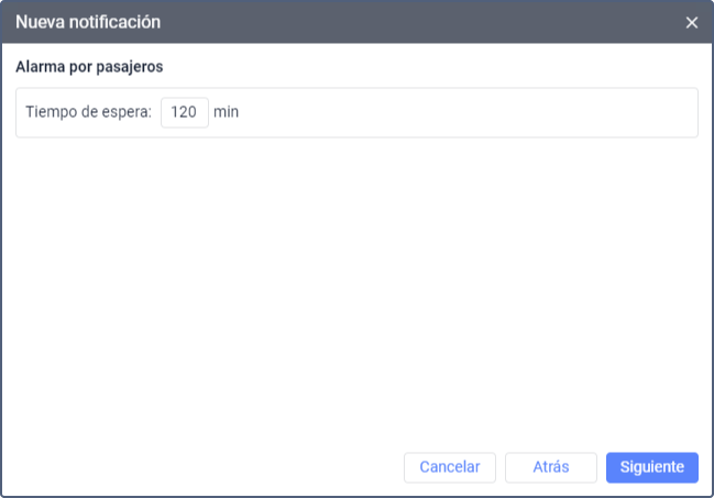 La notificación de este tipo se activa si algún pasajero del recurso escogido no ha bajado del vehículo (es decir, no se ha separado de la unidad) durante el tiempo indicado. El tiempo del campo Tiempo de espera se calcula desde la asignación del pasajero a la unidad.