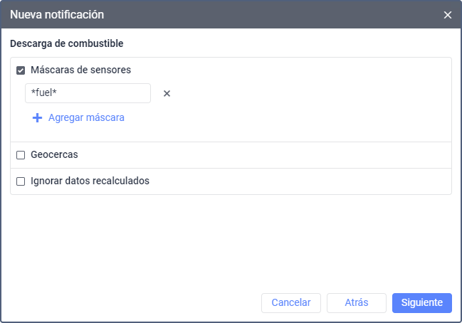 Si la opción Ignorar datos recalculados está activada, la notificación se envía solo una vez después de detectarse la descarga de combustible.