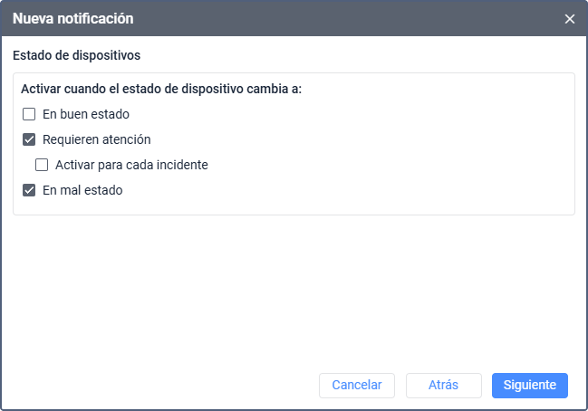 La notificación Estado de dispositivos permite monitorear el estado de dispositivos de unidades. Puede configurar la activación de la notificación cuando el estado del dispositivo cambia a los siguientes estados.