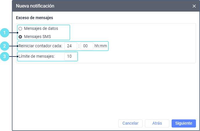 Con las notificaciones de este tipo puede controlar la cantidad de mensajes recibidos de la unidad durante un tiempo determinado. Pueden ser mensajes ordinarios con datos (coordenadas, valores de sensores, etc.) o mensajes SMS.
