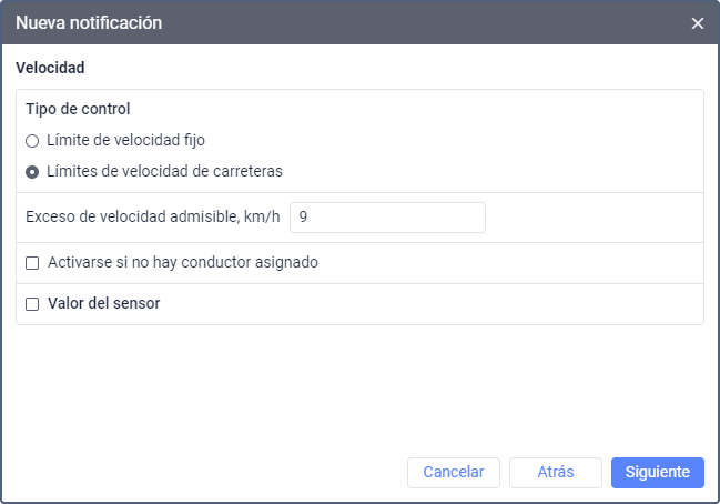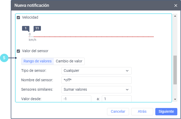 Si es necesario, ajuste las condiciones adicionales para la notificación: velocidad de la unidad seleccionada en el paso 1 y valor de su sensor. La opción Valor del sensor se configura del mismo modo que la notificación de tipo del mismo nombre.