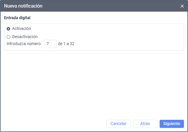 La notificación se activa cuando se activa o desactiva la entrada digital del dispositivo. Para configurar la notificación, indique el número de la entrada digital en la pestaña Activación o Desactivación respectivamente.