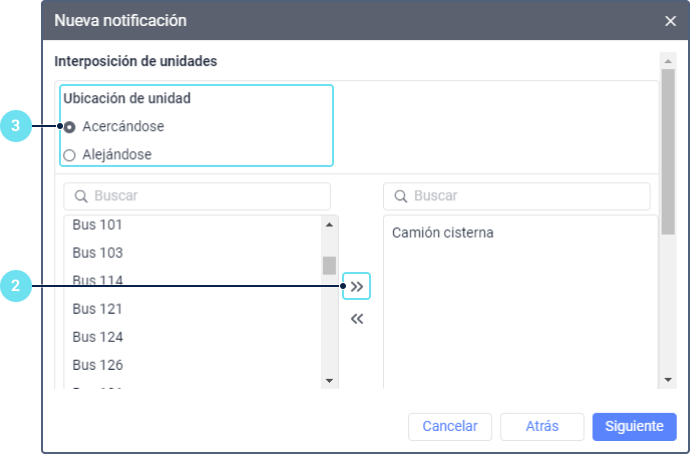 Transfiere a la parte derecha de la ventana una unidad o varias unidades la distancia hasta las cuales se toma en cuenta al activar la notificación. Para facilitar la búsqueda de la unidad necesaria, emplee el filtro dinámico encima de la lista.