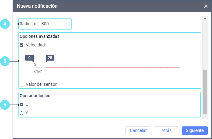 En el campo Radio, escriba la distancia entre las unidades al disminuirse o aumentarse la cual tiene que generarse la notificación.