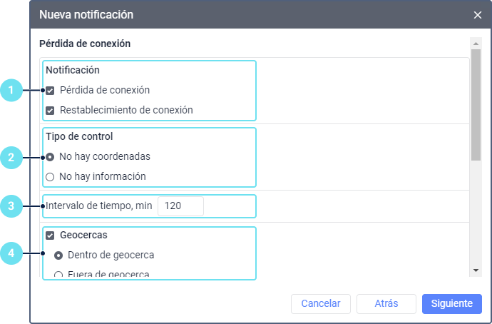 En las notificaciones de tipos Geocerca, Dirección, Interposición de unidades, Velocidad, Pérdida de conexión (con el tipo de control No hay coordenadas) no se toman en cuenta: