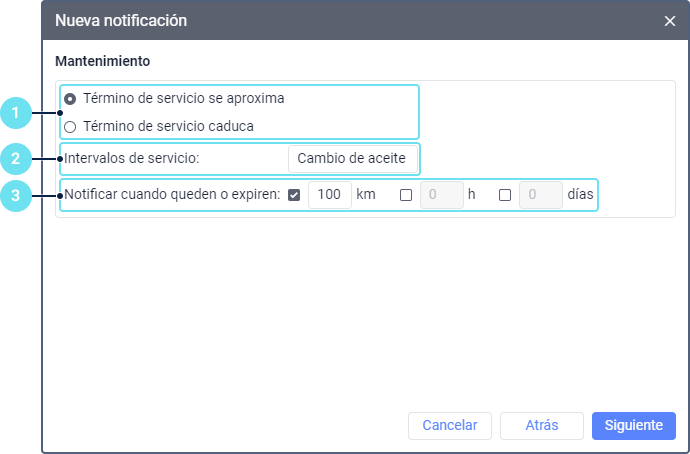 Además, si ha creado la notificación para varios o todos los intervalos de mantenimiento, esta deja de activarse en cuanto se atrase por lo menos uno de los servicios.