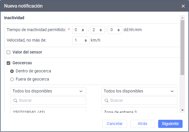 | Tiempo de inactividad permitido | Especifique durante cuánto tiempo una unidad puede permanecer estacionaria antes de que se active la notificación. Este valor no puede ser superior a 30 días. |
