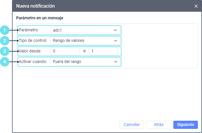 - Fuera del rango. La notificación se activa al recibir valores que no se encuentran en el rango indicado.