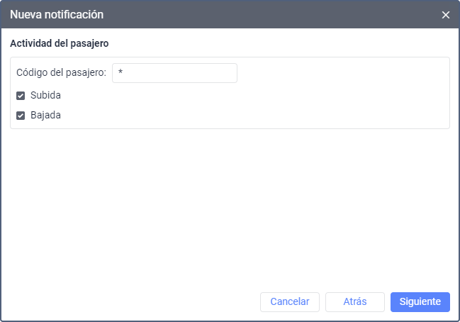 Si quiere seguir la subida y/o bajada de un pasajero determinado, indique su código en el campo Código del pasajero. Se puede indicar varios códigos o sus máscaras separándolos por comas sin espacios. Si está indicado el carácter * (asterisco), la notificación se aplica a todos los pasajeros.