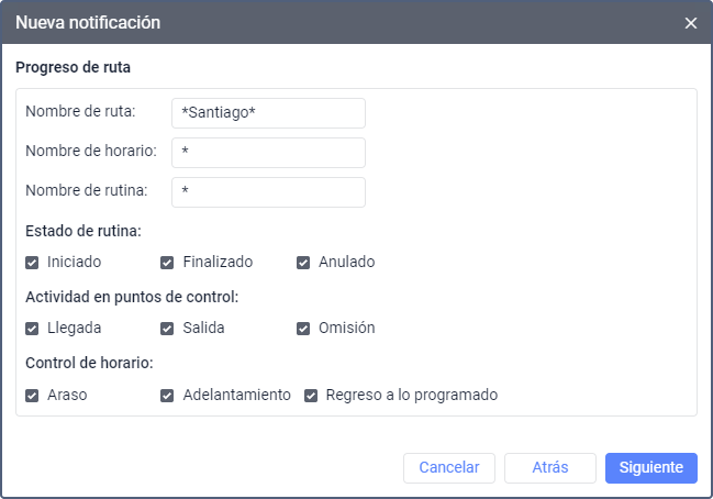 El campo Conductor está disponible solo para notificaciones de asignación del conductor. En él puede escribir el código o máscara del código del conductor para recibir notificaciones sobre su asignación. Se puede indicar varios códigos o sus máscaras separándolos por comas sin espacios. Si en el campo está el carácter * (asterisco), la notificación se aplica a todos los conductores.