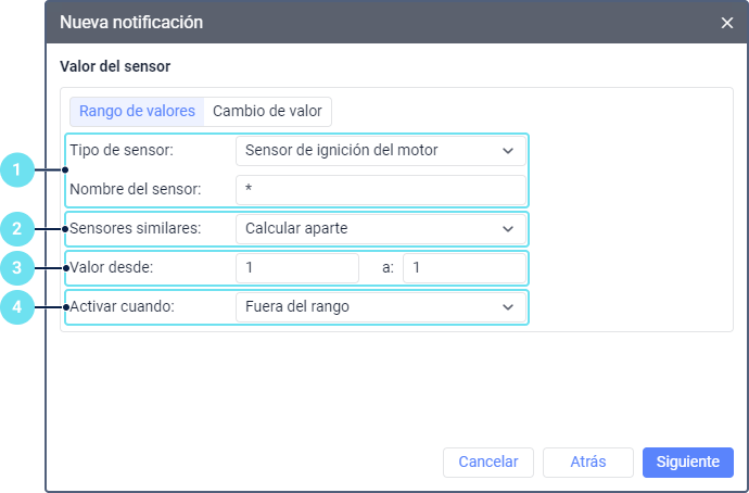 - Indique los valores mínimo y máximo del sensor. Si necesita controlar un valor específico, introduce el mismo número en los campos Valor desde y a, por ejemplo, de 1 a 1.
