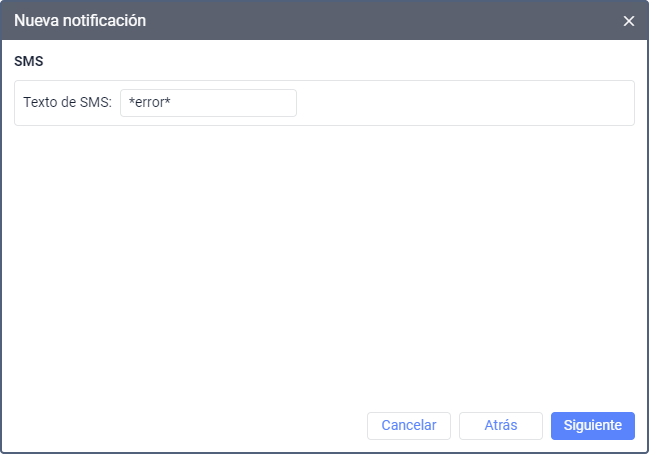 Una notificación de este tipo avisa sobre la recepción de un mensaje SMS. Por defecto, en el campo Texto de SMS, está *, es decir, la notificación se aplica a cualquier mensaje SMS. Puede introducir una máscara de texto para que la notificación se active solo cuando el mensaje recibido contiene un texto indicado. Puede ser útil, por ejemplo, cuando el dispositivo envía un mensaje de contenido determinado en caso de detectar errores.