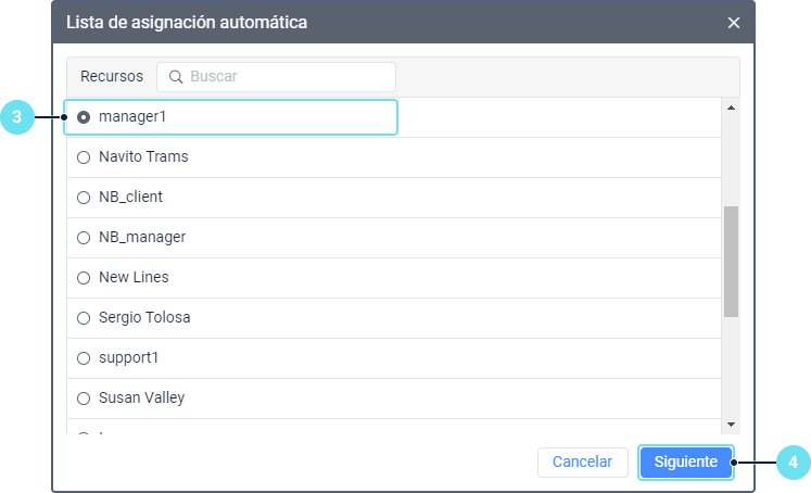 3. Escoja el recurso los pasajeros del cual deben asignarse automáticamente. Para conocer qué pasajeros pertenecen a un recurso determinado, aplique el filtro por recurso a la lista de pasajeros (se encuentra a la derecha del botón Crear).