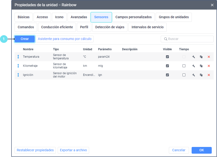 1. Para todas las unidades a las que quiere asignar automáticamente pasajeros cree un sensor de tipo Sensor de pasajeros. El parámetro depende del dispositivo utilizado y sus ajustes.