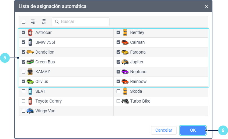 • Utilizar unidad en tareas, notificaciones, rutas, repetidores, a las unidades que deben utilizarse al asignar y separar pasajeros automáticamente.