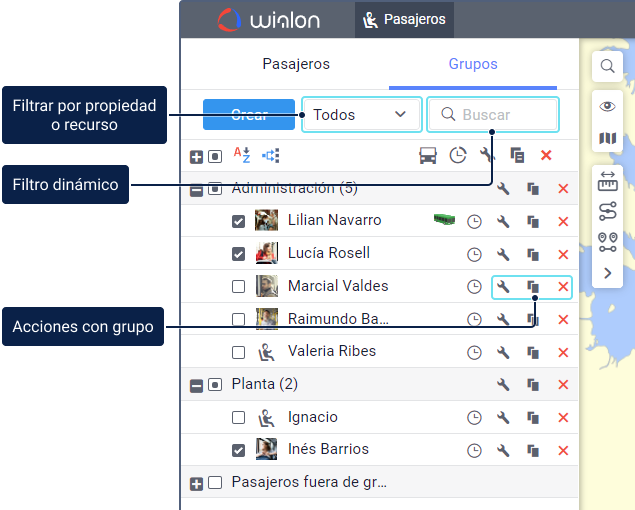 . Para facilitar la búsqueda del grupo necesario, emplee el filtro dinámico o filtro por propiedad (pasajeros asignados o no asignados) o por recurso.