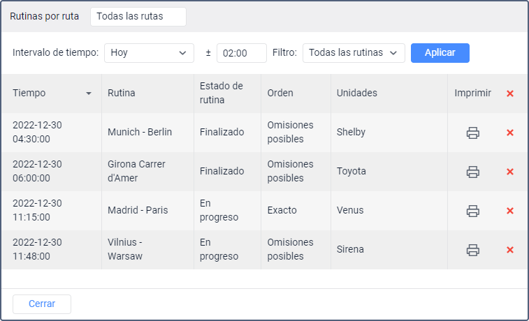 | Imprimir | Icono para imprimir la rutina. La información que se imprime consta de dos tablas. La primera contiene la información sobre la rutina: nombre, descripción, estado, unidades, tiempo de activación, nombre de ruta y horario; la segunda, información sobre sus puntos (número de orden, dirección, hora de llegada y de salida si está indicada en el horario). |