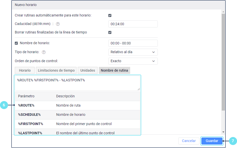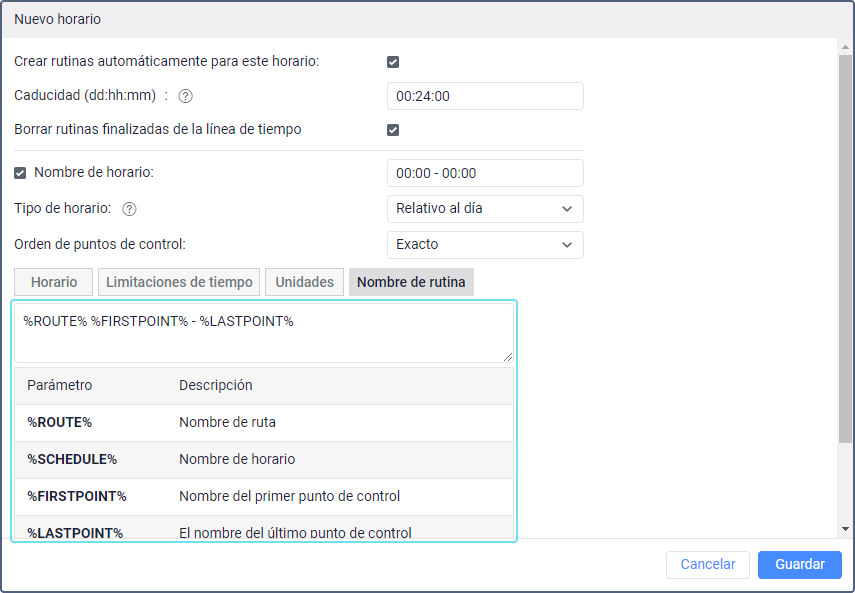 | Relativo a la activación | Horario de este tipo se puede aplicar en cualquier tiempo y solo para rutinas creadas manualmente. En este caso, la hora de llegada al punto de control indicada se calcula desde el momento de activación de la rutina. La hora de activación se establece manualmente al crear la rutina. |