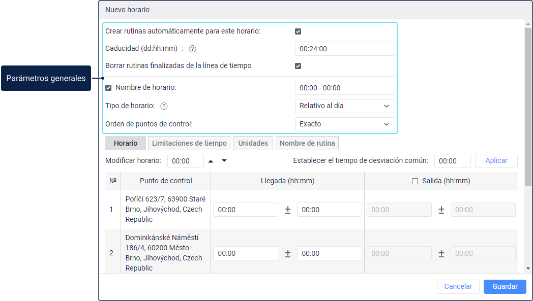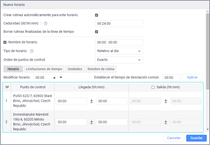En la pestaña Horario, se muestra la lista de puntos de control. Para cada uno de ellos puede indicar la hora de llegada y salida de él.