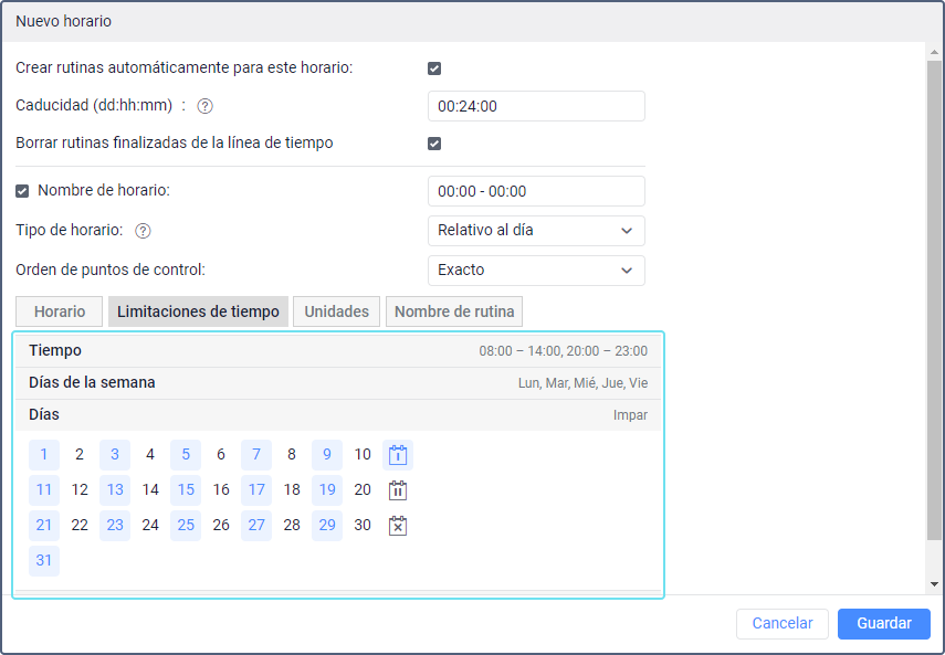 En esta pestaña, puede indicar el tiempo y escoger días y/o meses cuando se debe aplicar el horario. Por ejemplo, puede aplicarse solo días laborables y durante el tiempo de trabajo o solo días impares, etc. Para más información sobre cómo establecer limitaciones de tiempo, consulte esta página.