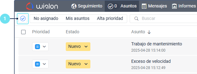 | Horas de motor* | El valor del contador de horas de motor en el momento del trabajo de mantenimiento. Por defecto se muestra el valor actual, pero puede editarlo. Este campo se muestra solo para asuntos del tipo Trabajo de mantenimiento. |