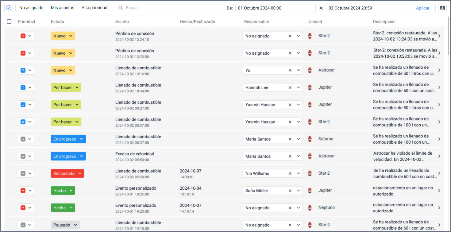 Por defecto, los asuntos se ordenan por la hora de registro del evento, es decir, del más reciente al más antiguo.