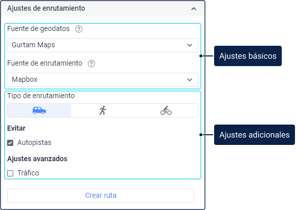 Esta sección consiste de ajustes básicos y adicionales que permiten planificar rutas teniendo en cuenta las siguientes particularidades: