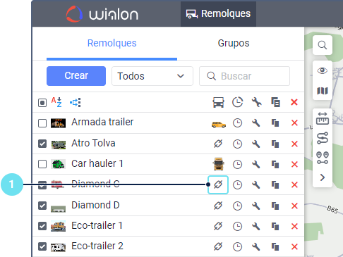 1. Haga clic en el icono   al lado del remolque necesario en la lista de remolques o sus grupos. El icono está inactivo () si no tiene el derecho de acceso Crear, modificar y eliminar remolques al recurso.