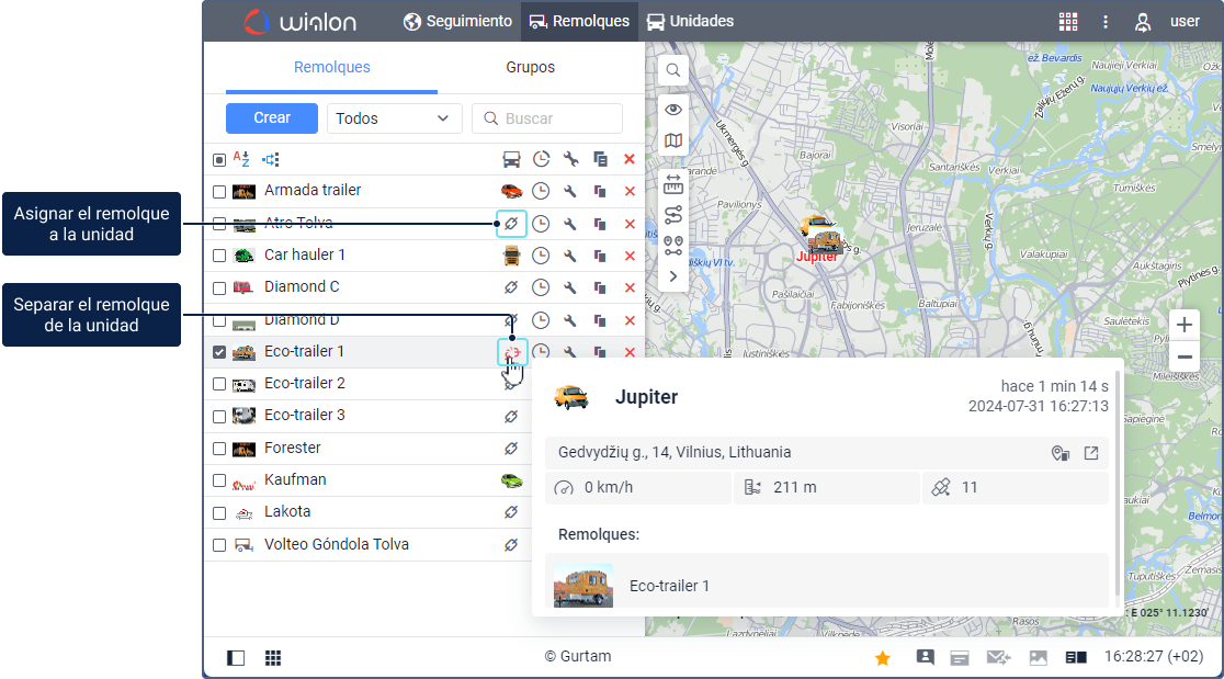 Se puede asignar remolques a la unidad y separar de ella manual o automáticamente. Después de hacerlo, se puede gestionar la historia de asignaciones.