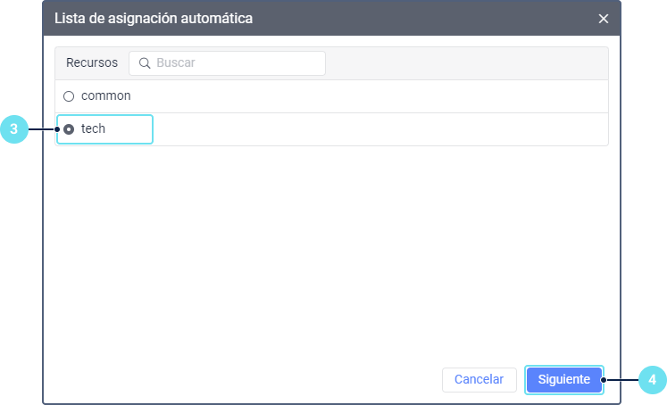3. En la lista de recursos, escoja uno los remolques del cual deben asignarse automáticamente. Para conocer qué remolques pertenecen a un recurso determinado, aplique el filtro por recurso a la lista de remolques (se encuentra a la derecha del botón Crear).