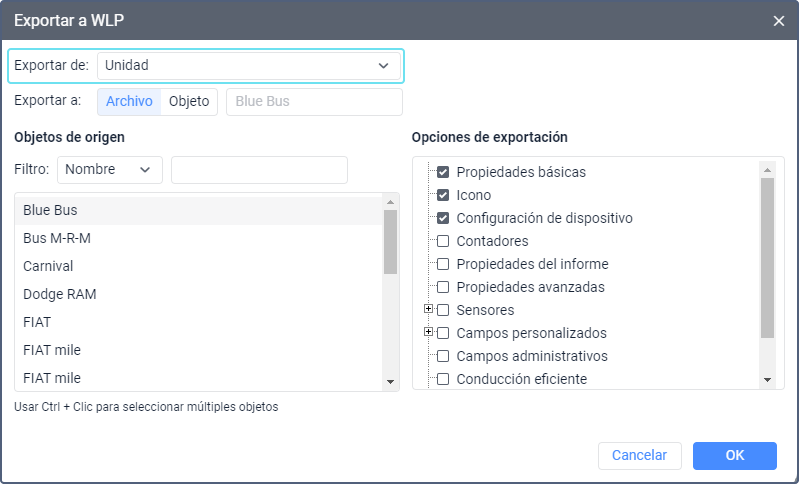Para exportar propiedades de la unidad, seleccione en el menú el punto Exportar a WLP y, en la ventana que se ha abierto, indique Unidad en el campo Exportar de. Vea la guía detallada aquí.