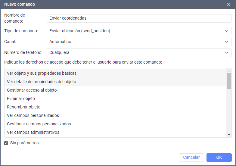 | Derechos | En esta sección hay que escoger los derechos de acceso que debe tener el usuario para enviar el comando. Para escoger varios derechos, haga clic en sus nombres apretando la tecla Ctrl.Además de los derechos escogidos en esta sección, el usuario también debe tener el derecho de acceso Enviar comandos a la unidad. |