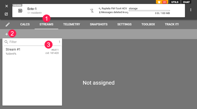 - Asigne al flujo el dispositivo flespi creado en el paso 1. Para hacerlo, acceda a la pestaña Devices y haga clic en la línea del dispositivo flespi para abrir la ventana de ajustes. En la pestaña Streams apriete el botón