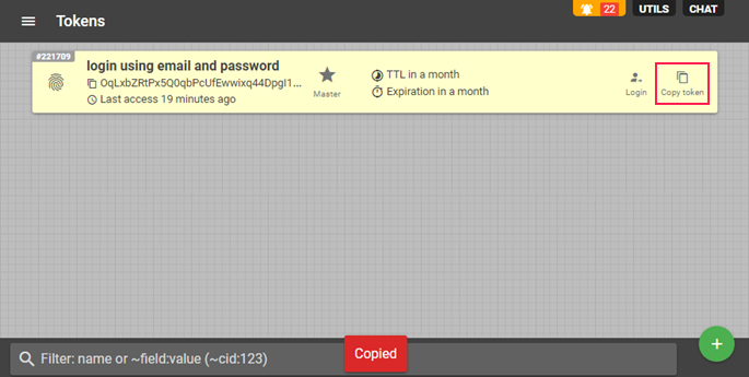 - Copie el token en la plataforma flespi (pestaña Tokens).