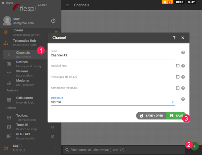 - Cree un canal para recibir datos en flespi: abra la pestaña Channels, apriete el botón