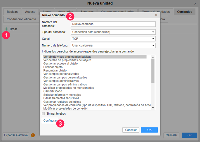 - Cree un nuevo comando en las propiedades de la unidad en Wialon.