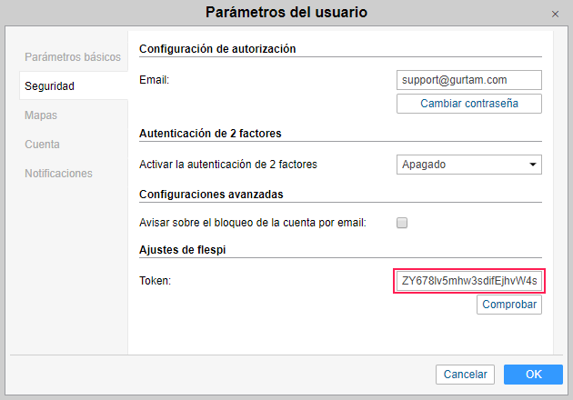 - En Wialon, pegue el token flespi copiado en el campo Token en la pestaña Seguridad de los parámetros del usuario del nivel superior.