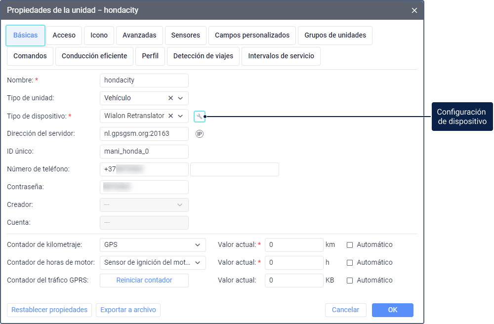 En la pestaña Básicas, también puede ver y configurar contadores que se utilizan para calcular kilometraje, horas de motor y tráfico GPRS.