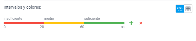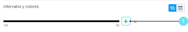 En esta sección puede crear intervalos para valores de sensores e indicar un color y descripción para cada intervalo. Los intervalos deben especificarse para los valores de sensores obtenidos después de aplicar todas las transformaciones: expresiones en el parámetro, tabla de cálculo y validación.