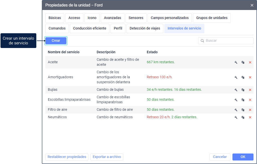 En la lista de intervalos, se muestra el nombre de cada servicio, su descripción (si hay) y el estado de ejecución. En la columna Estado, puede ver cuántos kilómetros, horas o días quedan antes del inicio del servicio. Si el servicio está retrasado, la información de su estado se resalta en rojo.