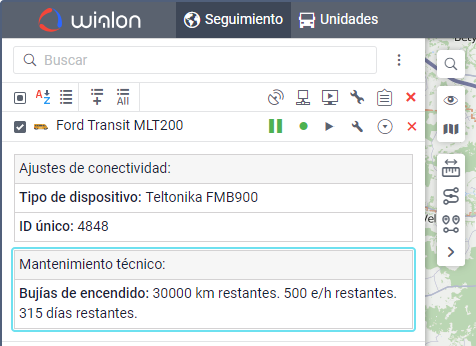 Los intervalos de servicio creados pueden mostrarse en la descripción emergente de la unidad y en la información ampliada de la unidad en la pestaña Seguimiento.