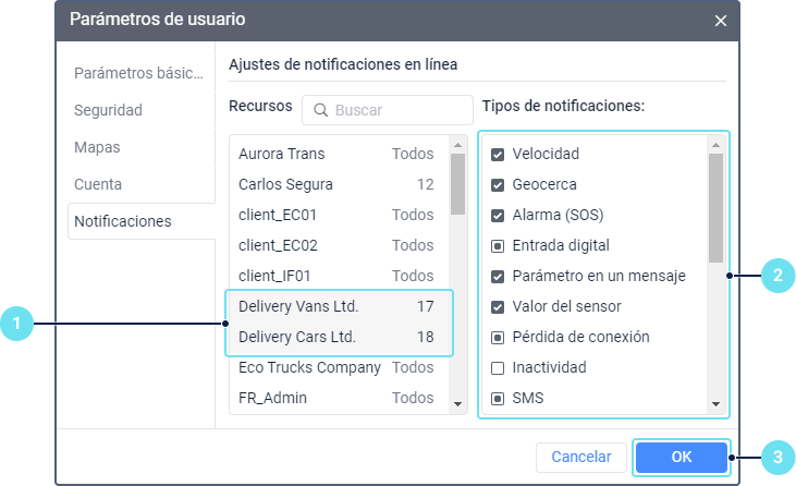 - En la lista Tipos de notificaciones, marque qué tipos de notificaciones quiere recibir. Al lado del nombre del recurso, se muestra la cantidad de tipos seleccionados para él. Si varios recursos están seleccionadas, los tipos de notificaciones que están marcados solo para algunos de ellos, se señalan con un cuadrado negro.