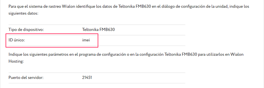 Para determinar qué tipo de identificador se usa para un dispositivo, encuéntrelo en la lista de la sección Dispositivos GPS de nuestro sitio web. Para cada dispositivo compatible con Wialon tal información se escribe en el campo ID único. Como el ID único de un dispositivo puede usarse su IMEI, número de serie o un valor digital indicado por el usuario (custom). Por ejemplo, en la página de Teltonika FMB630 hay siguiente información: