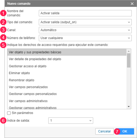 - Indique lo siguiente: nombre del comando (1); tipo del comando (2); canal (tipo de conexión) (3); número de teléfono a que hay que enviarlo (4); derechos de acceso necesarios para ejecutar el comando (5); índice de salida que hay que activar (6).