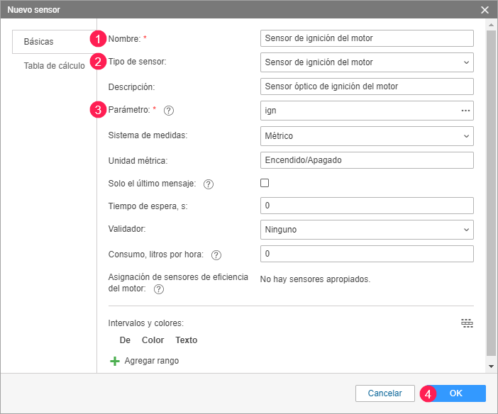 En la pestaña Sensores de las propiedades de la unidad se puede crear, modificar y eliminar sensores. Vamos a crear un sensor del tipo Sensor de ignición del motor que se utiliza mientras determinar viajes y estacionamientos, así como en contadores de kilometraje y horas de motor.