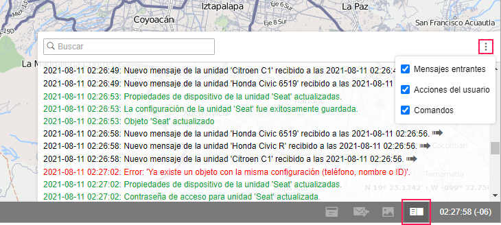 Además de los mensajes entrantes de las unidades, en el historial se muestran otras acciones del usuario (creación, modificación y eliminación de elementos, etc.) y comandos enviados a las unidades.