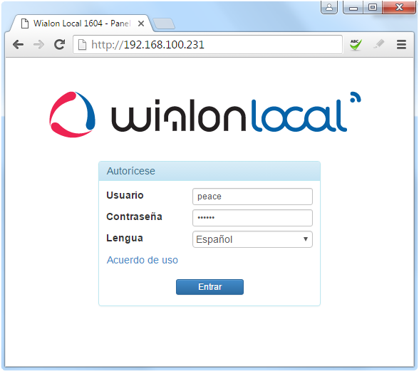 6. Introduzca esta URL en la barra de direcciones de su navegador. Utilice el nombre y la contraseña dados mientras adquirir Wialon Local para autorizarse.
