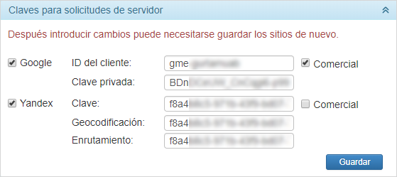 Marque el servicio cartográfico necesario, indique la clave para el mismo y apriete el botón Guardar. Los campos a llenar para las claves personal y comercial de Google se diferencian (en vez de Clave están disponibles ID del cliente y Clave privada). Para los mapas Yandex se puede indicar también claves separadas para la geocodificación y el enrutamiento.